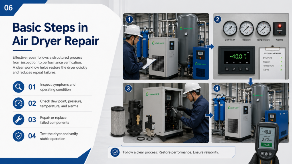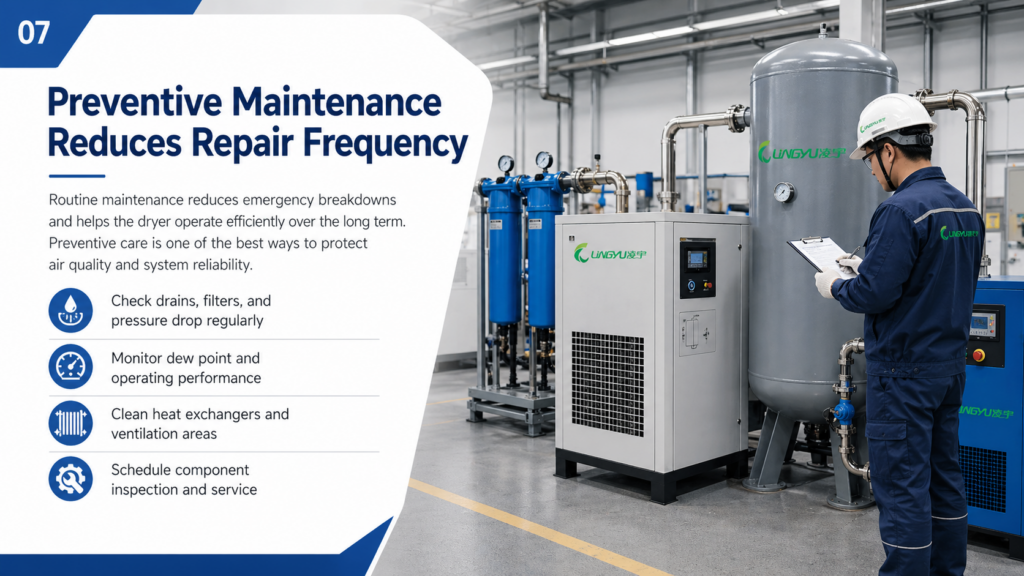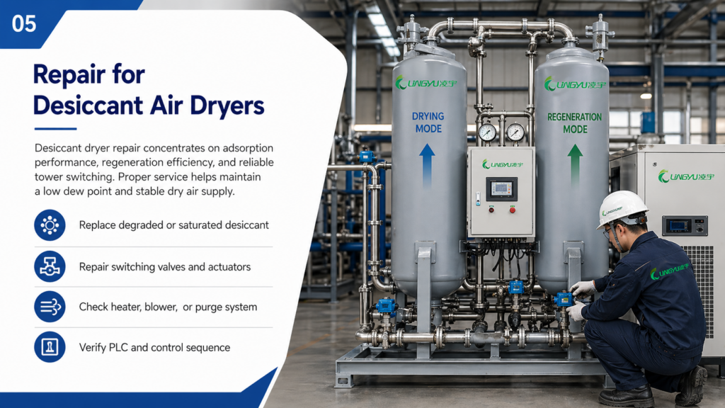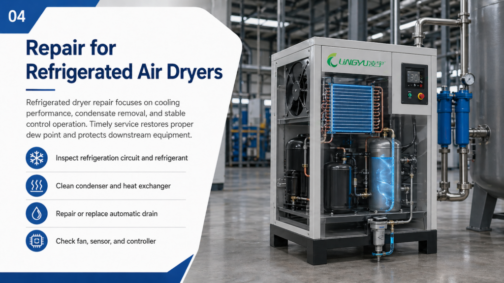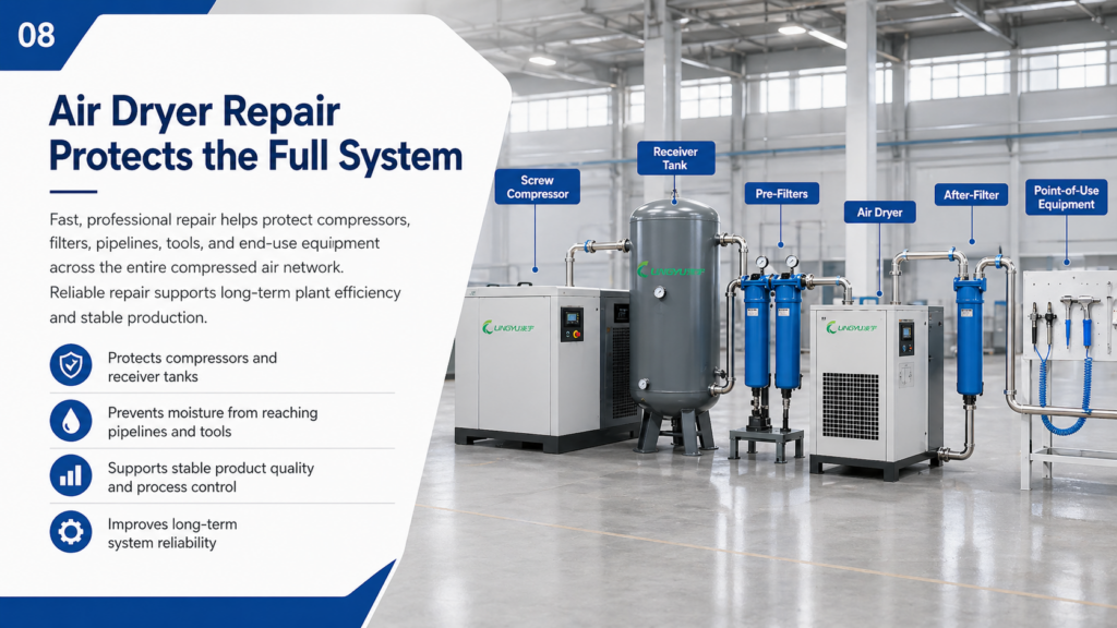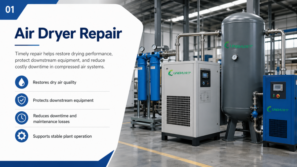 Industrial users should choose repair support carefully. A reliable service team should understand compressed air systems, dryer types, control components, and plant operating conditions.