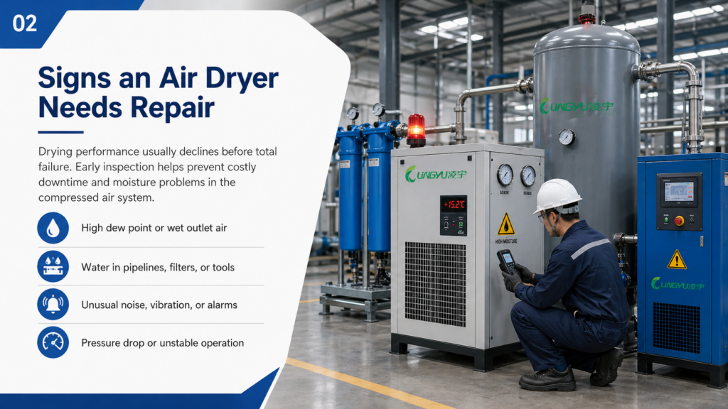 By understanding the warning signs, common failures, and maintenance priorities, industrial users can respond faster and keep their air treatment systems operating efficiently. In demanding production environments, professional repair support and regular preventive maintenance are key to long-term dryer performance and dependable plant operation.