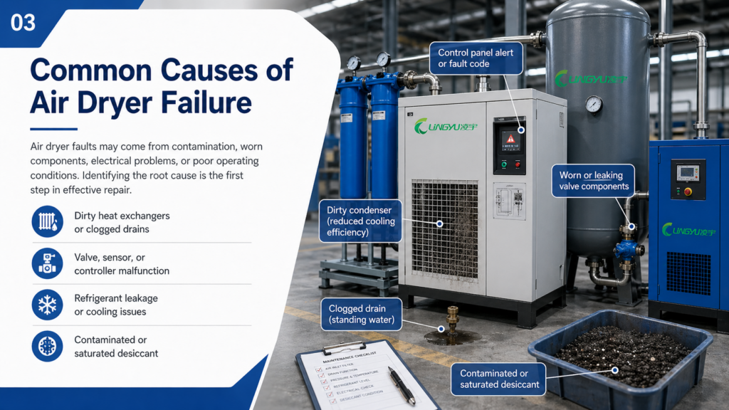 Air dryer problems can come from mechanical wear, electrical issues, poor maintenance, contamination, or unsuitable operating conditions. The exact cause depends on the dryer type and system design.