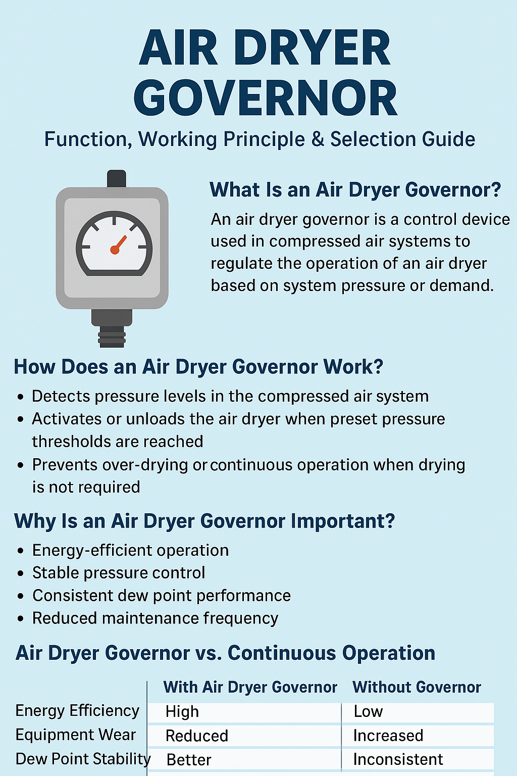 What Is an Air Dryer Governor? An air dryer governor is a control device used in compressed air systems to regulate the operation of an