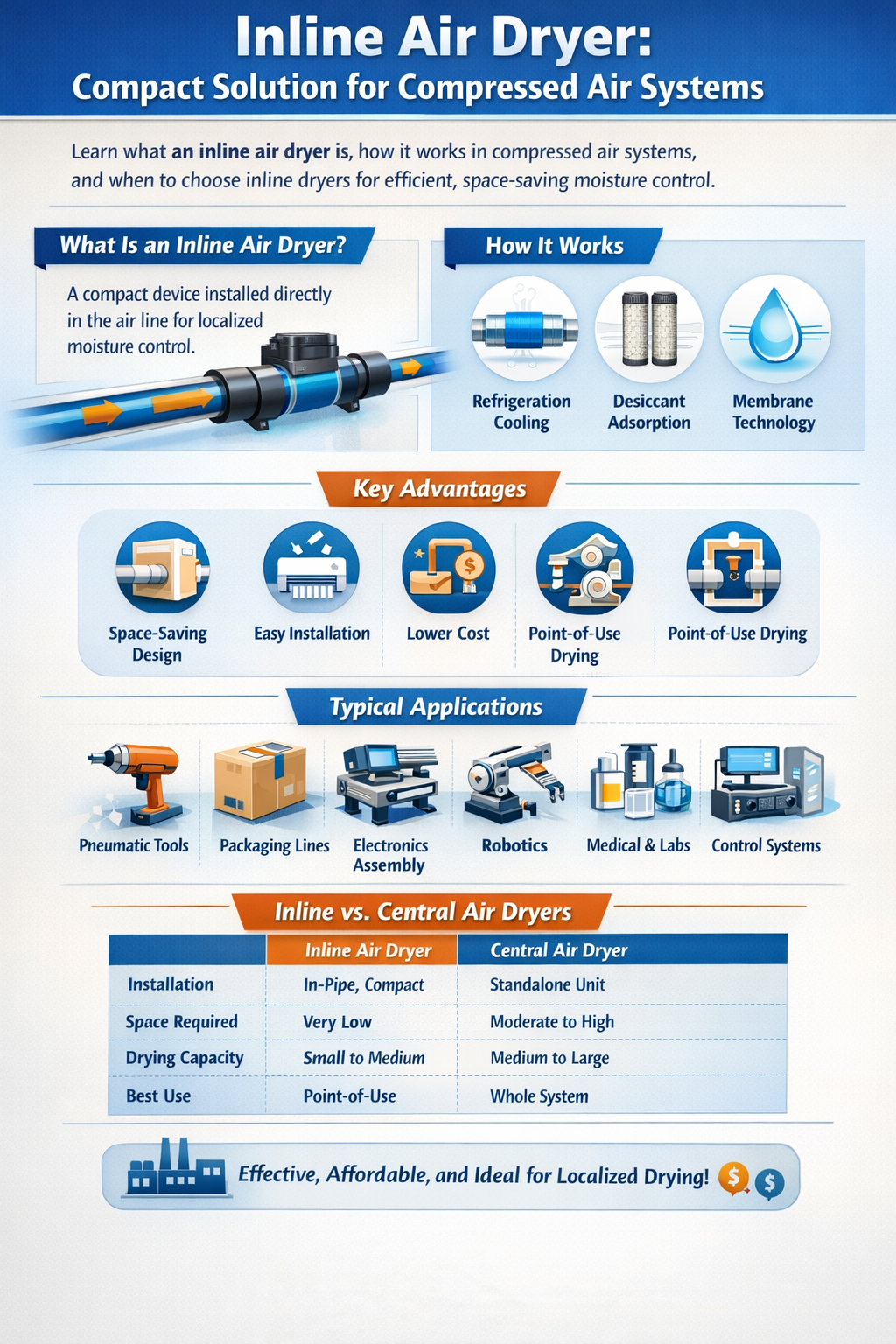 What Is an Inline Air Dryer? An inline air dryer is a compact moisture removal device installed directly into a compressed air pipeline. Unlike standalone