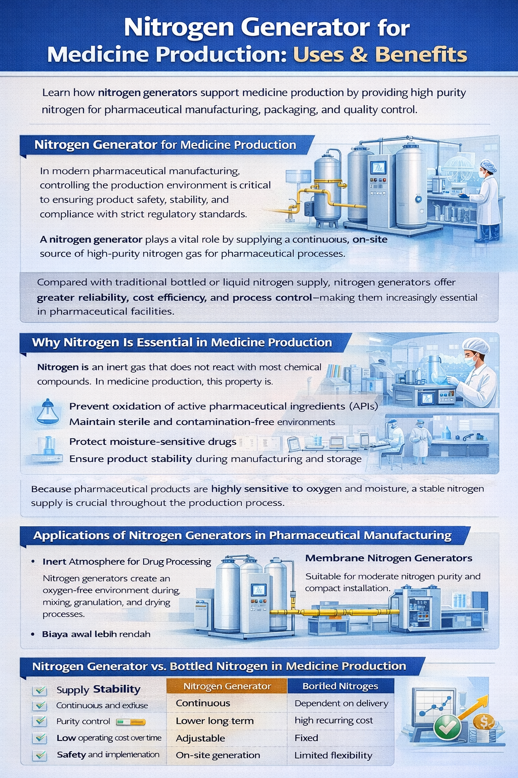 Nitrogen Generator for Medicine Production In modern pharmaceutical manufacturing, controlling the production environment is critical to ensuring product safety, stability, and compliance with strict regulatory