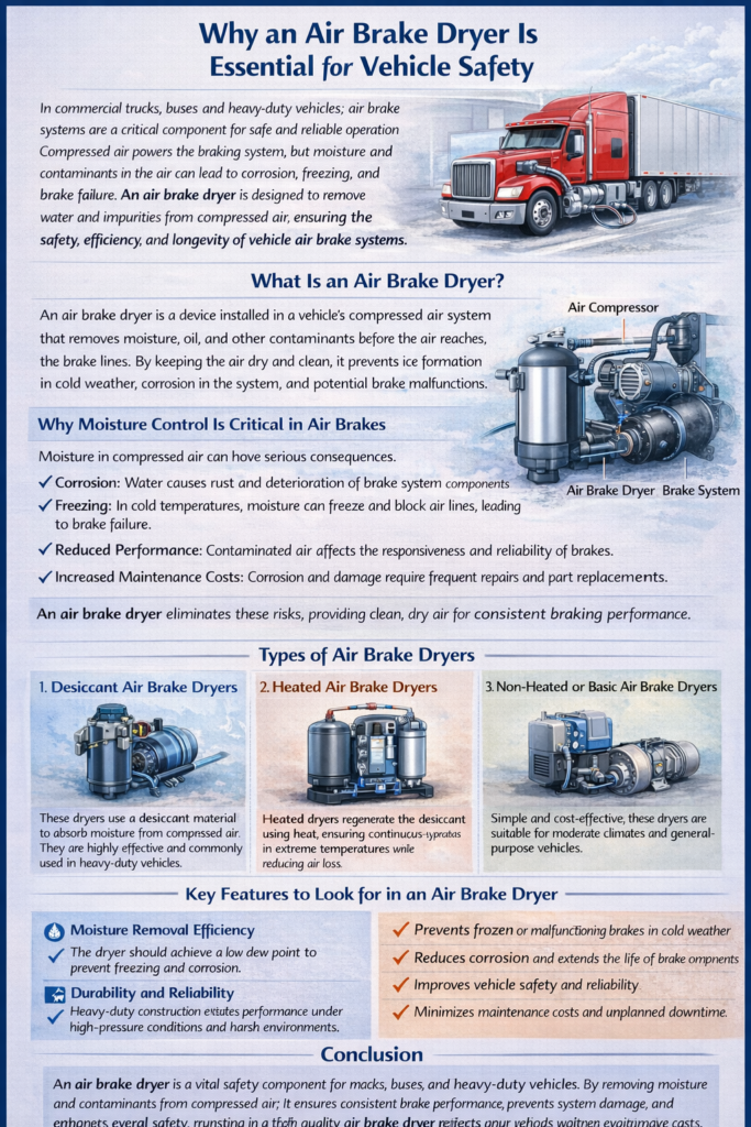 An air brake dryer is a vital safety component for trucks, buses, and heavy-duty vehicles. By removing moisture and contaminants from compressed air, it ensures consistent brake performance, prevents system damage, and enhances overall safety. Investing in a high-quality air brake dryer protects your vehicle, reduces maintenance costs, and keeps drivers and passengers safe on the road.